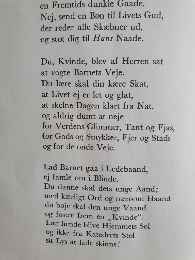 Fra Arilds tid hver kvinde god/gik glad ved mandens side./I hjemmets fred ”i med og mod”/hun sysled om på lette fod;/hun gav ham kækt sit unge mod,/hun lærte ham at stride./Nu kvinden går sin egen vej,/sit hus og barn hun vogter ej,/vil bort fra hjemmet glide…Du kvinde sattes her på Jord/at virke i en gerning stor,/men ej som mandens lige./Du barnet tage skal i favn,/du smykkes skal med modernavn/i hjemmets stille rige./…Ja, har du opfyldt Herrens bud,/da kan du trygt i renheds skrud/opad mod Himlen stige! (Fra digtet Til Danmarks kvinder af Chr. Richardt; fra digtsamlingen Hilsen til Danmark (1915) udgivet ved Michael Agerskov; her tilpasset moderne stavemåde)