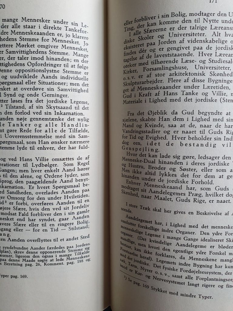 Fra evighed af var mørket overalt. I mørket var lyset; i lyset var tanken og viljen. Men tanken og viljen var ikke i mørket. I lyset var alt det godes mulighed, men i mørket var alt det ondes mulighed. Ukendte evigheder svandt. Langsomt droges tanken og viljen mod hinanden. Langsomt bredte lyset sig, det blev klarere og renere. Det blev dæmring. Ukendte evigheder svandt. Tanken og viljen droges end nærmere mod hinanden. Lyset bredte sig mere og mere, det strålede klart og skønt. Det blev morgen. Atter svandt ukendte evigheder. Tanken og viljen nærmede sig hinanden end mere. Lyset vældede frem overalt, det flammede klart, skønt og herligt. Det blev dag. Atter svandt ukendte evigheder. Tanken og viljen forenedes. Da fremsteg af lyset ved tankeviljens kraft en flammende skikkelse, et åndeligt Væsen – Gud. Men i samme stund lod Gud tolv strålende skikkelser, åndelige væsener, fremtræde af lyset. Og disse blev Guds Hjælpere, Guds Tjenere. Da begyndte tiden. (Fra Vandrer mod Lyset; her let bearbejdet).