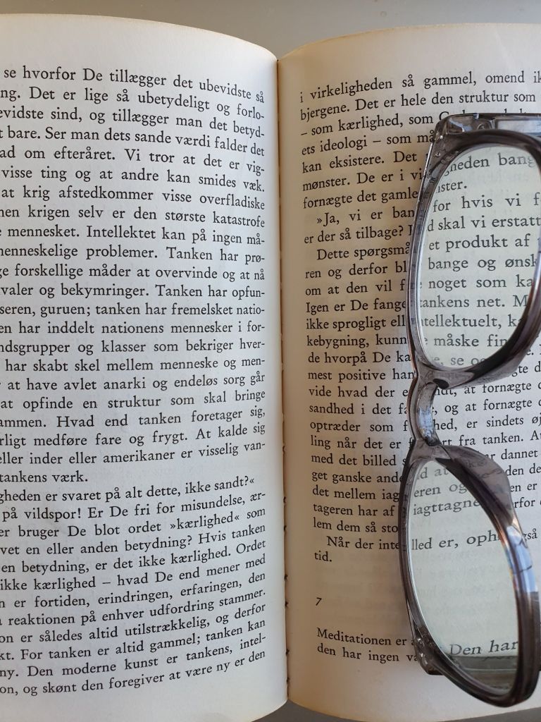 Og jeg skriver disse ord, som er tanke og tanke i tid, jeg søger at forstå og formidle det, der er hinsides tanke, tid og ord med tanke i tid og med ord. Og så er jeg og læseren jo lige vidt. Jeg retter min tanke og opmærksomhed mod Krishnamurtis tanker og ord, søger at forstå ved at opdele, at analysere, at skabe skel mellem det jeg forstår, og det, der måske principielt ikke kan forstås, kun opleves, det der er bag ordene, og som ikke er ord.